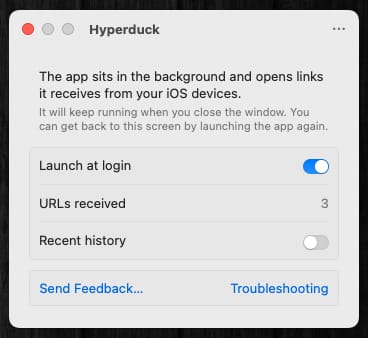Mac側でHyperduckの設定を見ると、「URLs received」のところに、iPhoneから送信されたURLの数が表示される。