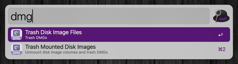 他にも、痒いところに手の届く多様な便利ツールがあり、「Purge Disk Images」というワークフローは、Macでアプリをインストールするときに使用する「.dmg」ファイルを、Alfredのコマンドだけでまとめて削除できる。