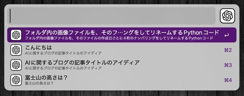 そのままスレッド内で会話を継続することも可能で、Alfredを離れることなく、キーボードの操作だけで、ChatGPTとの会話を、いつでもどこでも呼び出すことができる。