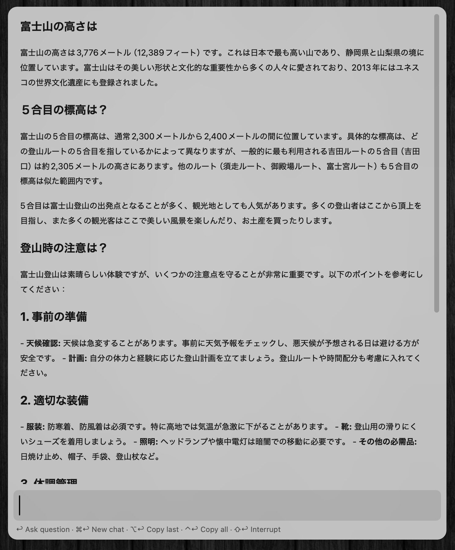 ストリーミングにも対応しており、ChatGPTの回答がリアルタイムで瞬時に表示されていく。