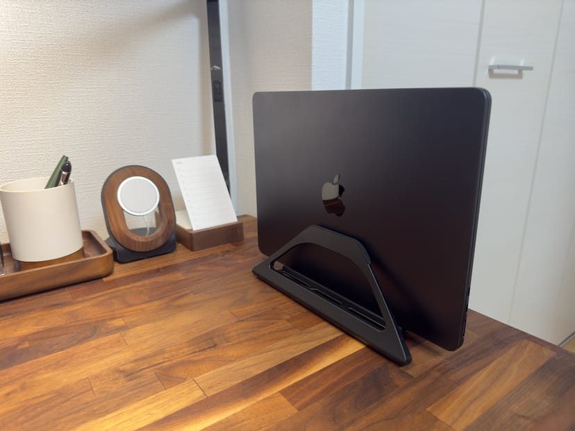 MacBookを自宅で使用する場合に、MacBook本体のモニターではなく外部ディスプレイを使用するならば、机の上のスペースを有効に活用するため、MacBookをタテ置きしたくなる。