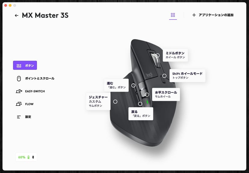 Logi Options+という専用アプリでは、ChromeやWordやPhotoshopなどのアプリごとに、ボタンの割り当てをカスタマイズすることもでき、自分好みの設定を行うことができる。