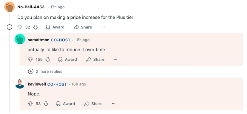 また、同じコメントに対して、サムアルトマン氏は、「むしろ値下げしたい」と返信している。