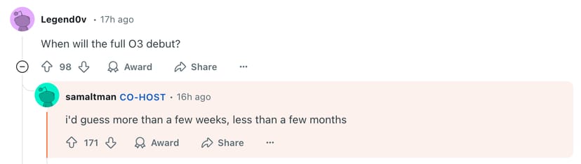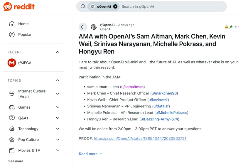 o3-miniのリリース当日には、サム・アルトマン氏ほかOpenAIの開発陣が、アメリカの大手掲示板サイト「Reddit」にて、ユーザーからの質問を公開で受け付ける「Ask Me Anything (AMA)」イベントを実施した。
