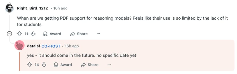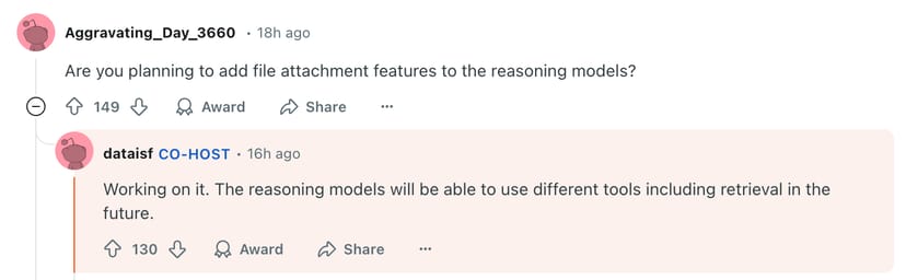 また、o1, o3などの推論モデルに対して、ファイルのアップロード(画像やPDFだけでなくコードファイルなど)を可能とする予定はあるか、と言う問いに対しても、現在準備中と回答されている。