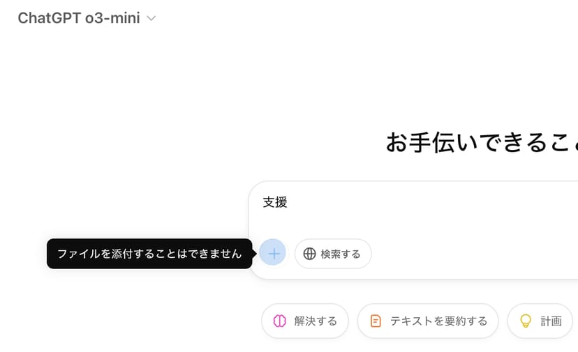 現状、ChatGPTで利用できるo3-miniでは、Web検索機能は利用できるものの、ファイルを添付することはできない。