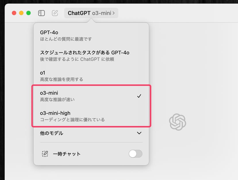 また、有料版のChatGPT Plusユーザーは、通常の「o3-mini」に加えて、「o3-mini-high」という更に推論能力の高いモデルを利用することもできる。