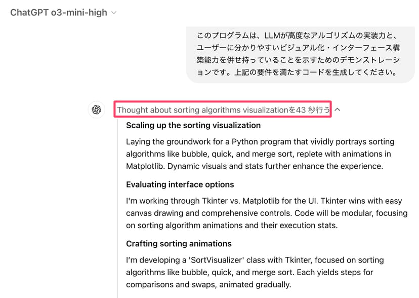ChatGPTのo3-miniは、現状、CoTをそのまま見せてはくれないが、CoTのサマリーを見せてくれる。