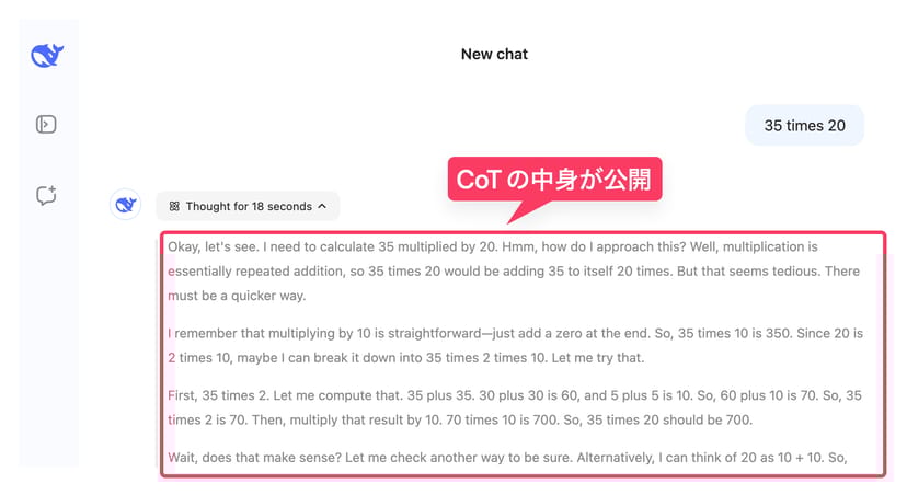 DeepSeekの推論モデル「R1(解説記事)」や、Googleの推論モデル「Gemini 2.0 Flash Thinking(解説記事)」などは、CoTが丸見えになっているので、CoTの仕組みを理解しやすい。例えば、DeepSeek R1に二桁の掛け算を聞いてみると、R1が自問自答しつつ、最適な解き方をいろいろ検討している様子が見て取れる。