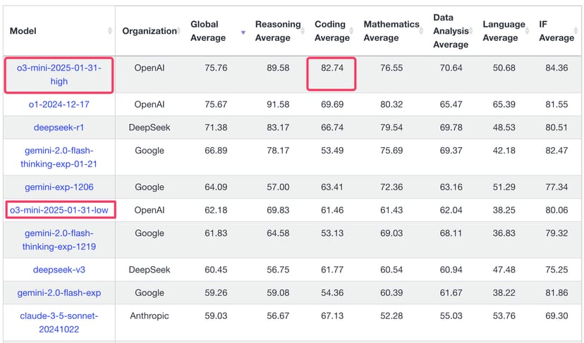 上記のLivebenchの表では、カテゴリごとにスコアが出ているが、「Coding Average」カテゴリでのo3-mini-highのスコアは82.74と、他者を圧倒していることが分かる。