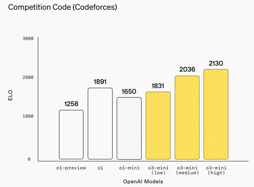OpenAIのニュースリリースによれば、o3-miniの3モデルは、競技プログラミングサイトであるCodeforcesにおけるELOレートでも、以下のスコアを叩き出している(12月の発表時よりもさらにスコアが向上している)。