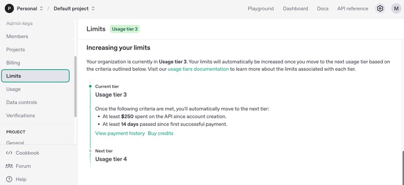ちなみに、Tier 3に最速で昇格したければ、アカウントに100ドルチャージして、1週間待つだけで良い。以前からアカウントを持っていた人は、100ドルチャージした瞬間に昇格する。