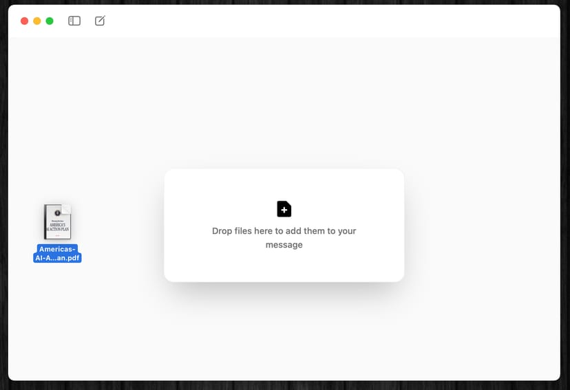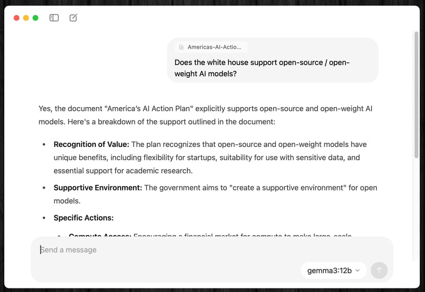 例えば、アメリカ政府が7月に公開した『AIアクションプラン』のPDFをダウンロードしてきて、ドラッグ&ドロップでOllamaに投げ込む。