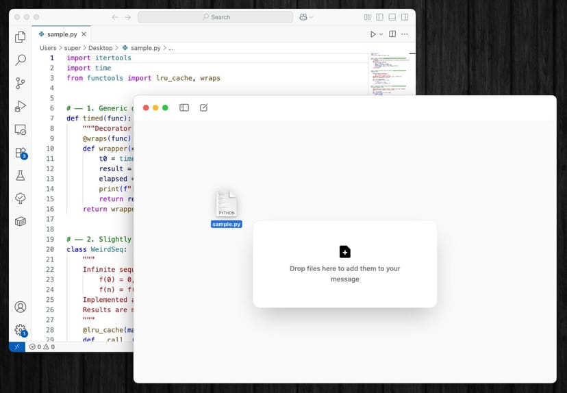 PDFと同様に、例えばPythonのスクリプトファイル.pyなども、チャットウィンドウに直接ドラッグ&ドロップして、その内容に関するチャットが可能である。
