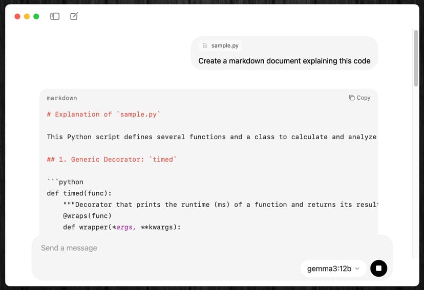 また、新しいOllamaアプリでは、単なるテキストチャットだけでなく、ファイルの読み込みも可能になった。