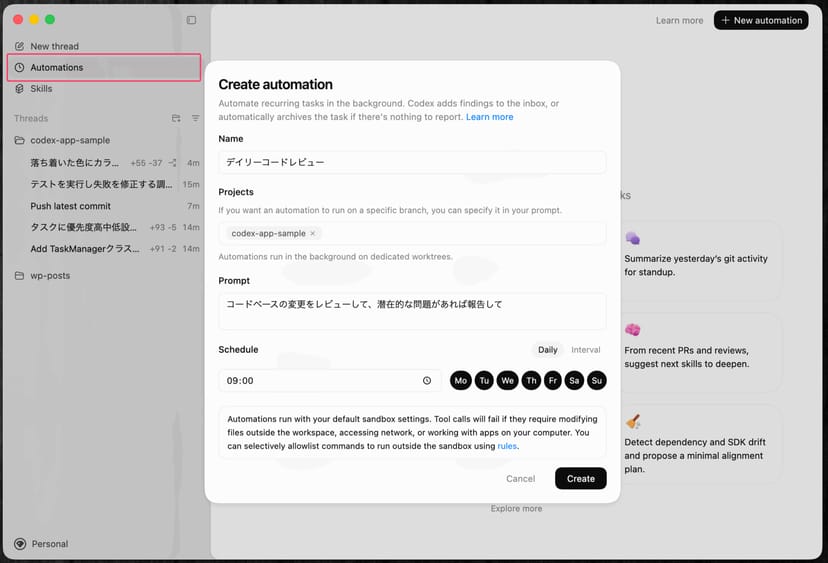 - 定期的な自動実行タスクを設定できる仕組み(Automations)