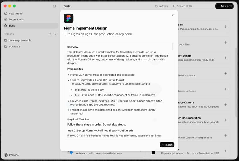 例えば、Figmaからデザインを取り込んでUIコードに変換したい場合、まずは「Skills」メニュー内で、「Figma Implement Design」スキルをインストールにする。
