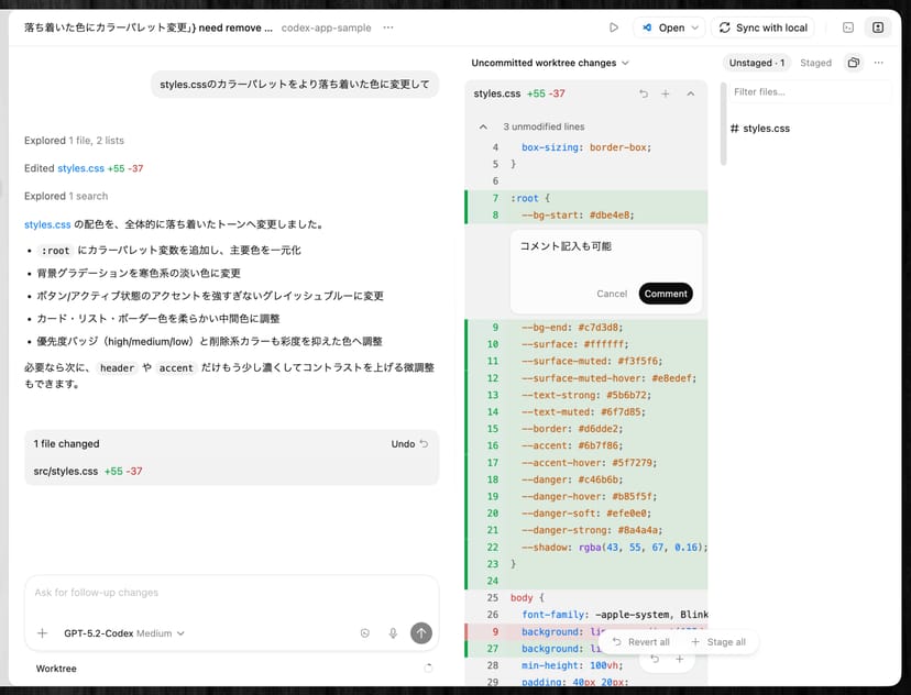 - Diffの確認: エージェントが加えた変更をdiffペインで確認できる。インラインコメントを追加してCodexに修正を依頼することも可能