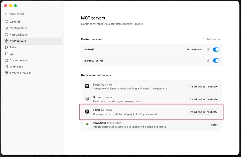 Codexの Settings > MCP servers から、MCPサーバーとの接続も可能なので、ここでFigmaのMCPを有効にしておこう。