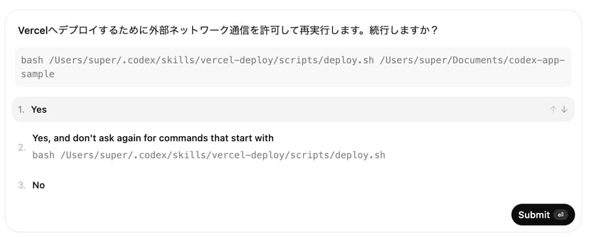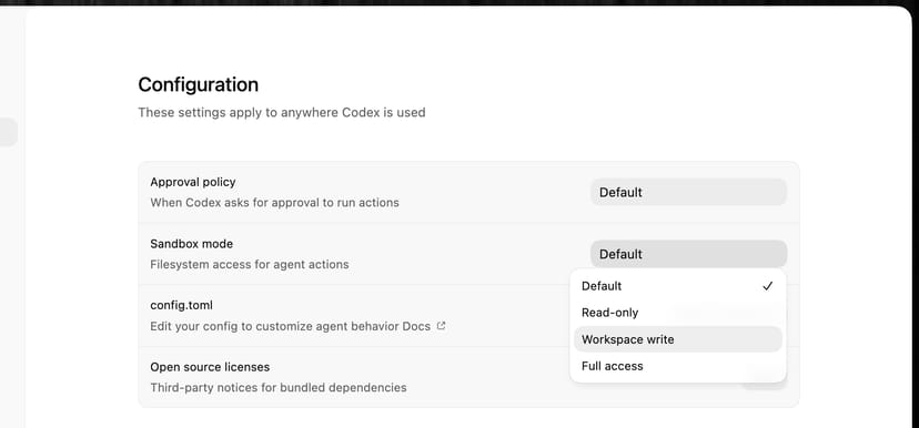 | Workspace Write | ワークスペース内のファイル読み書きとコマンド実行が可能。ネットワークアクセスは無効 |