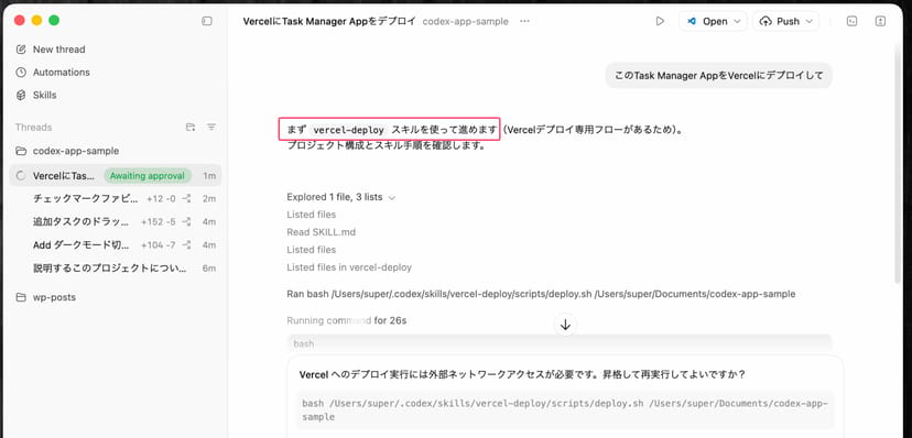 スキルを一度有効にしておけば、どのスキルを呼び出すべきかは、Codexが自動で判断してくれるので便利だ。