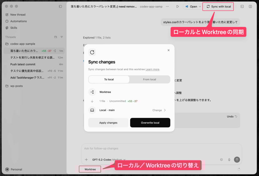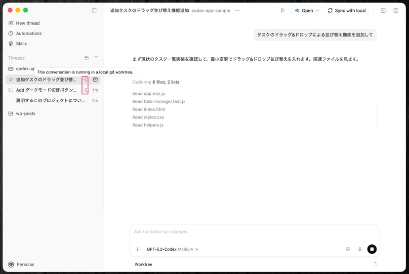 Codexデスクトップアプリでは、新しいスレッドを開始する際に「Worktree」モードを選択することで、各エージェントが分離された作業ディレクトリで独立して作業できる。