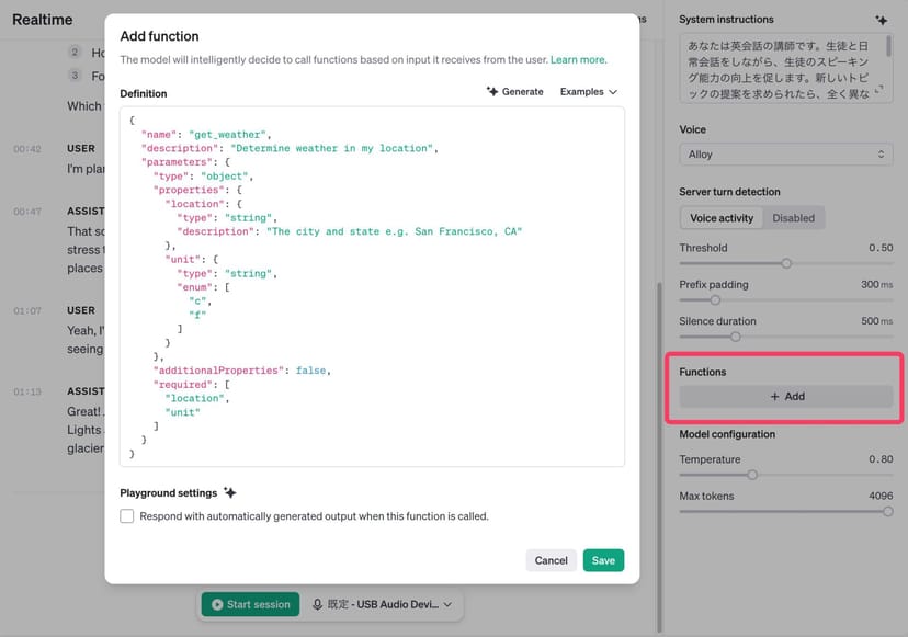 なお、Realtime APIでは、あらかじめ外部のAPIを呼び出す関数などを定義しておけば、AIに会話の途中で外部の情報から取って来させることも可能である。