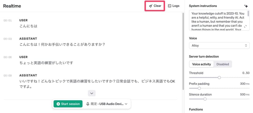 会話を止めるには、画面下部の「X」ボタンを押して録音を停止した後、「Clear」ボタンを押してスレッドをリセットする必要がある。