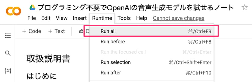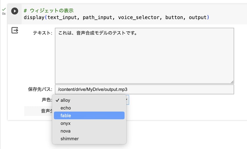 そこで、無料かつ分かりやすいインターフェースでPythonの実行環境が使えるGoogle Colaboratoryで、簡単にこのOpenAIのTTSモデルを試せるノートブックを作った。