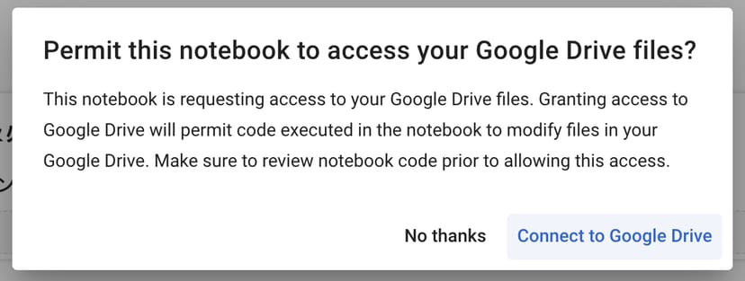 ステップ1で「全てのセルを実行」すると、このノートブックが自分のGoogleドライブにアクセスすることを許可するか、的なメッセージが表示されるので、許可するを選択して、Googleアカウントにログインする必要がある。