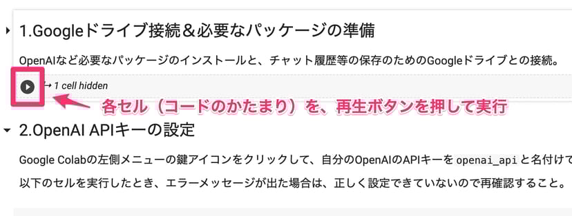 全てのコードブロックには以下の画像のような「再生ボタン」のようなものがあり、これをクリックすると、そのコードブロック内にあるコードが実行される。