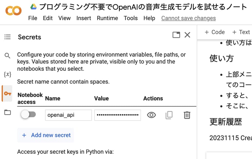 ここにAPIキーを登録しておくと、ノートブックの中のコードで、あなたのAPIキーを呼び出すことができる。