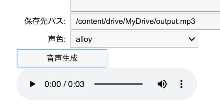 今回のノートブックは、Text-to-speechの音声合成モデルを利用するにあたって、AIが生成してくれた音声ファイル(.mp3)をGoogleドライブ上に保存する仕組みになっている。