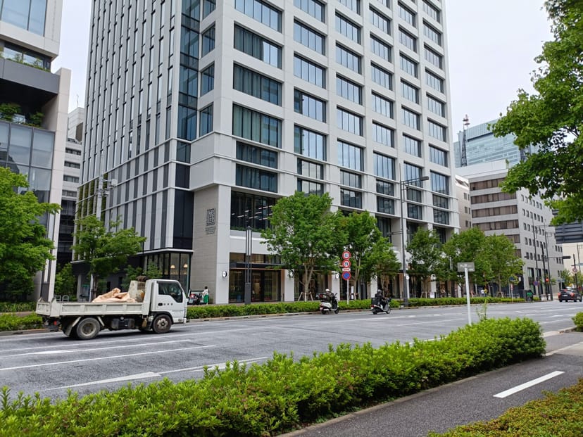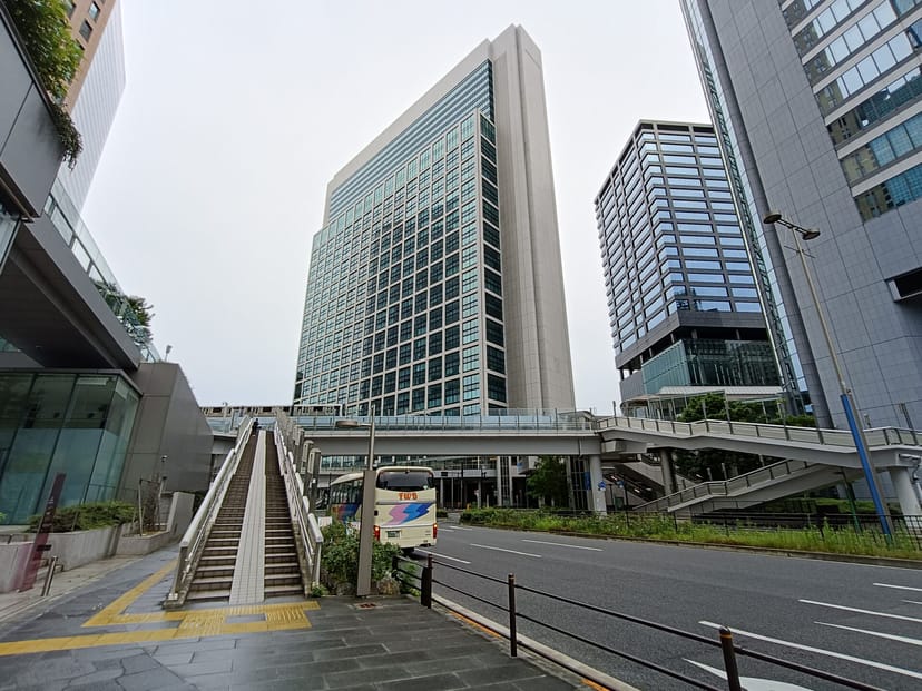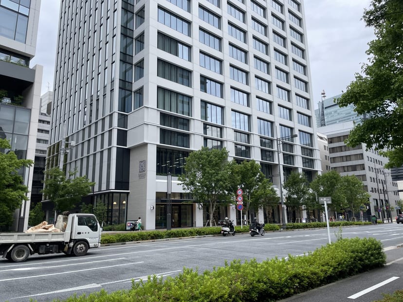 超広角カメラを使うと、立つ位置を変えていないのに、正面の高層ビルの最上階まで画角に収めることができた。