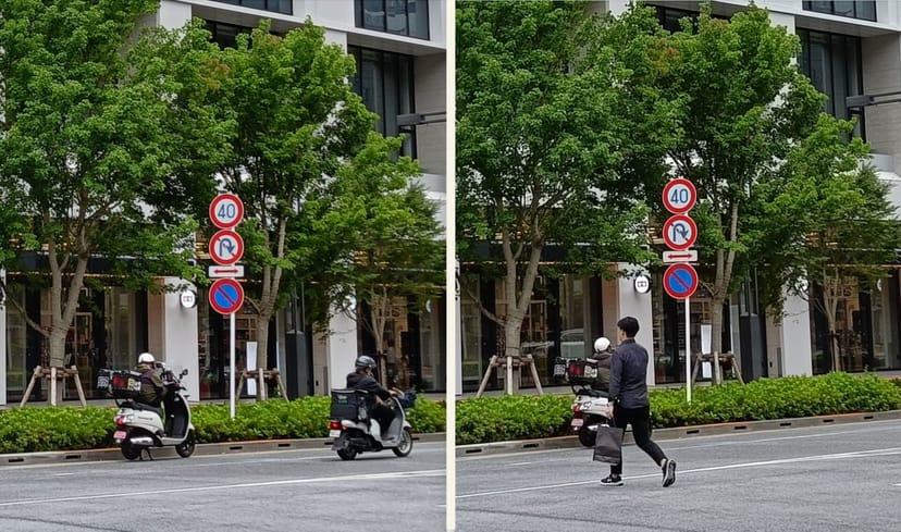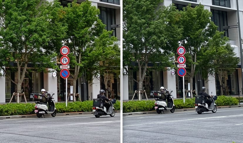 以下は、Reno11 Aの通常モード(左)と、高解像度モード(右)で撮影した同じ場所の写真を、左右に並べてみたものである。
