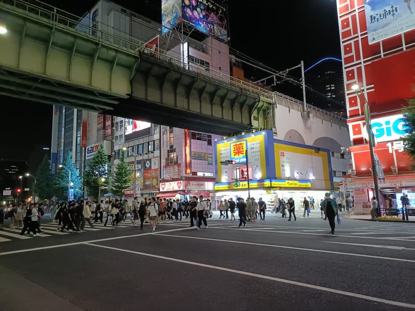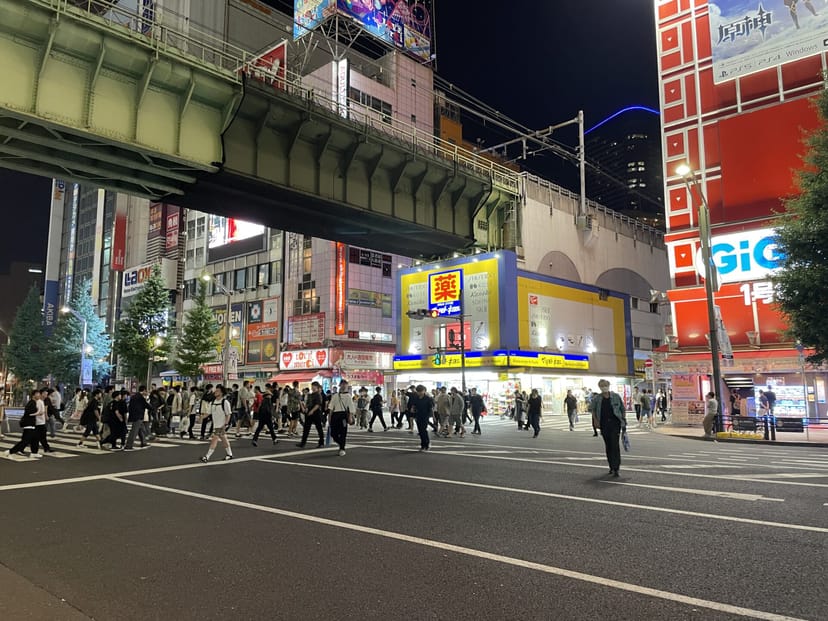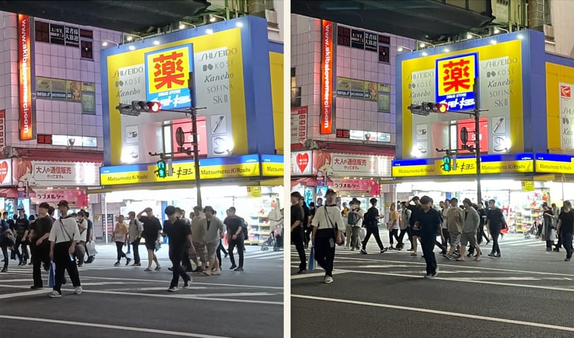 秋葉原の駅前の様子を、OPPO Reno11 Aと、iPhone 12でそれぞれ撮影している。なお、Reno11 Aは通常モードで撮影していることに注意して欲しい。