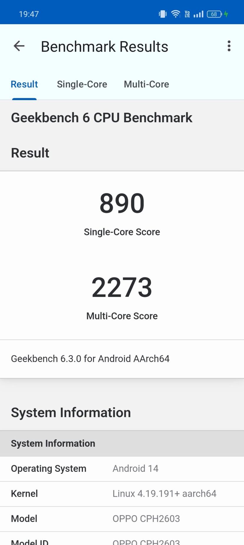 結果は以下の通りで、シングルコアで890、マルチコアで2273というスコアになった。
