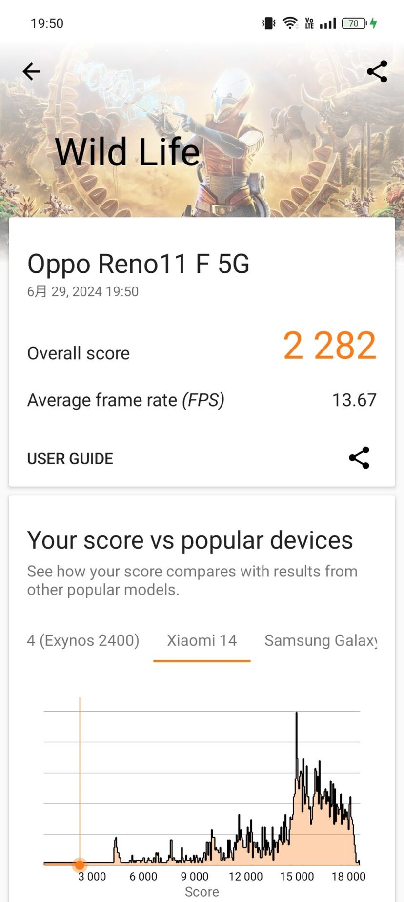 当然ながら、平均FPSは13.67、スコアも2282と低調だ。SamsungのGalaxy S23のスコアは12,000を超えてくるので、ハイエンド機と大きく差がある。