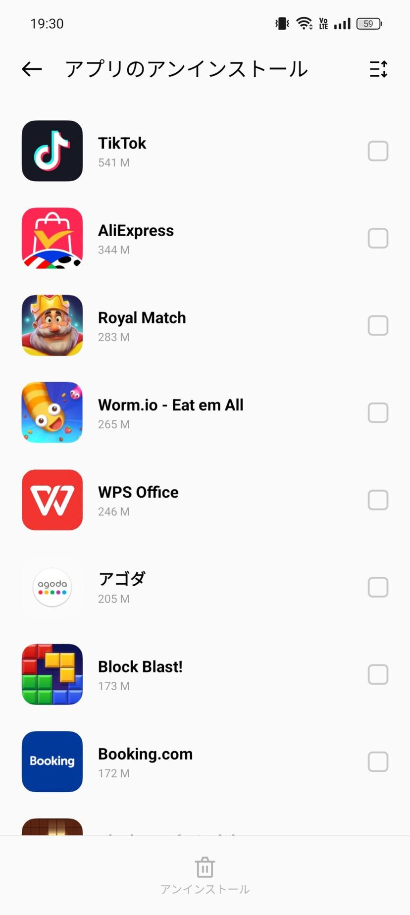 削除するのは面倒だが、App Marketを開いて「アプリのアンインストール」メニューに辿り着けば、以下のように一括で削除することができる。