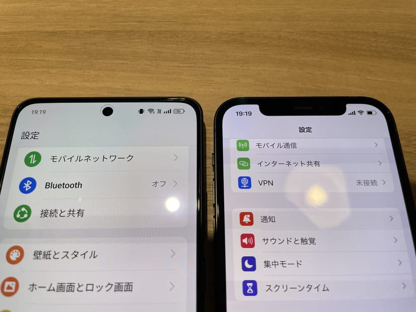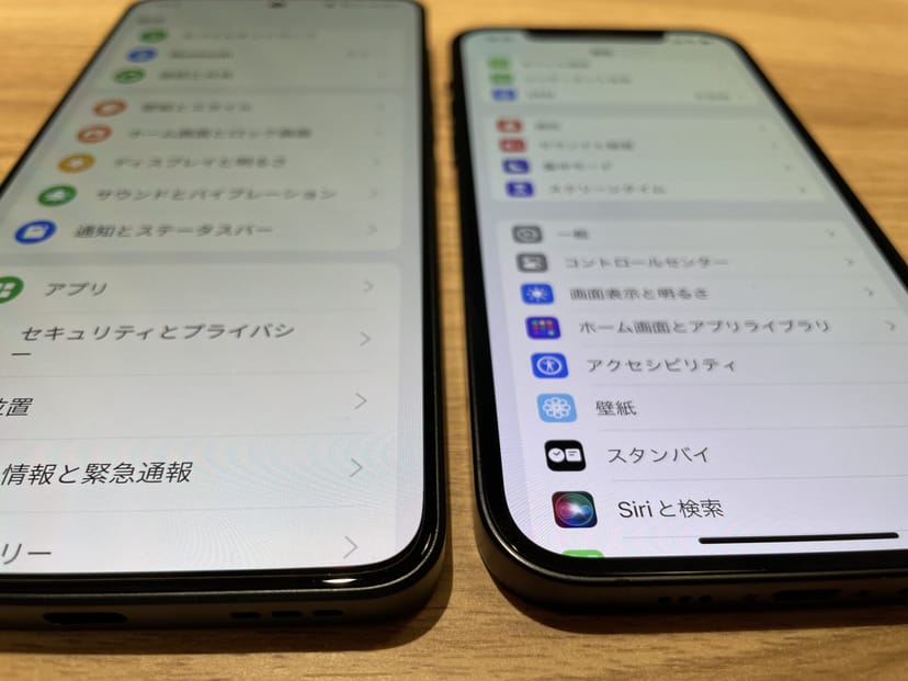 OPPO Reno11 AとiPhone 12のディスプレイを並べてみた写真が以下である。