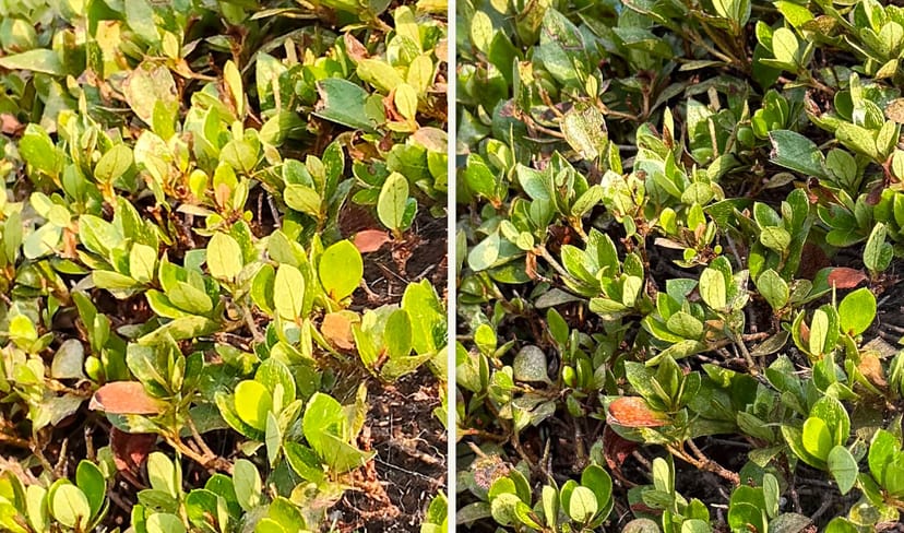 これは流石に、iPhone 16 Pro (右)の方が、より全体的にシャープで、葉の表面のディテールも豊富に描写できているように思える。