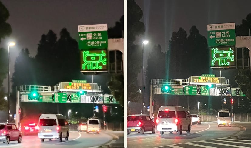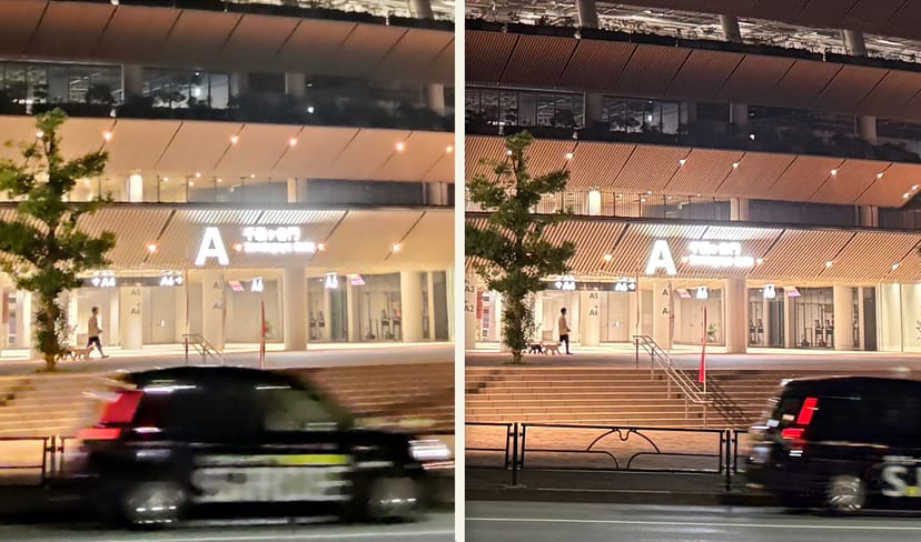 Oppo Reno 13A (左)の夜景写真は、iPhone 12 (右)と比べても、ノイズ処理によって車の輪郭や文字がつぶれ、のっぺりした印象となっている。