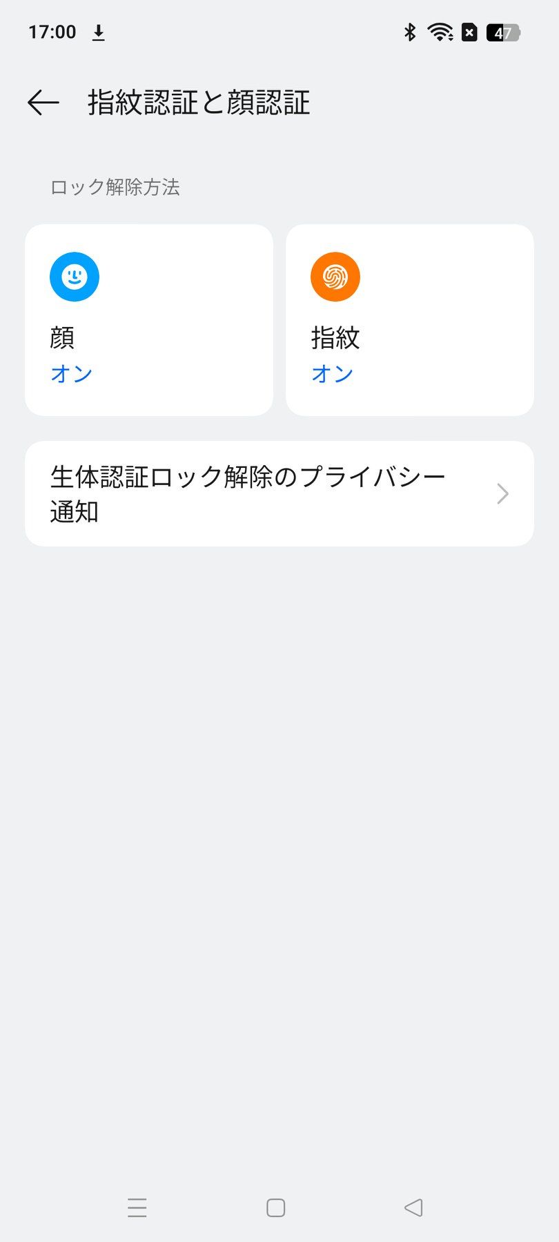 ただし、顔認証は画像による2D顔認証であり、iPhoneのように赤外線センサーなどを組み合わせたハイテクな顔認証ではないので、暗所では指紋の方がスムーズであるし、指紋に比べると若干セキュリティに不安が残る印象だ。