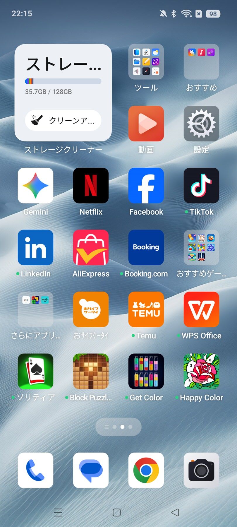 4万円台前半と安価であることの代償とも言えるが、FacebookやTikTok、ホテル予約サイト、中華系の通販サイトやゲームなどのアプリが多数プリインストールされており、かなりごちゃごちゃしている。