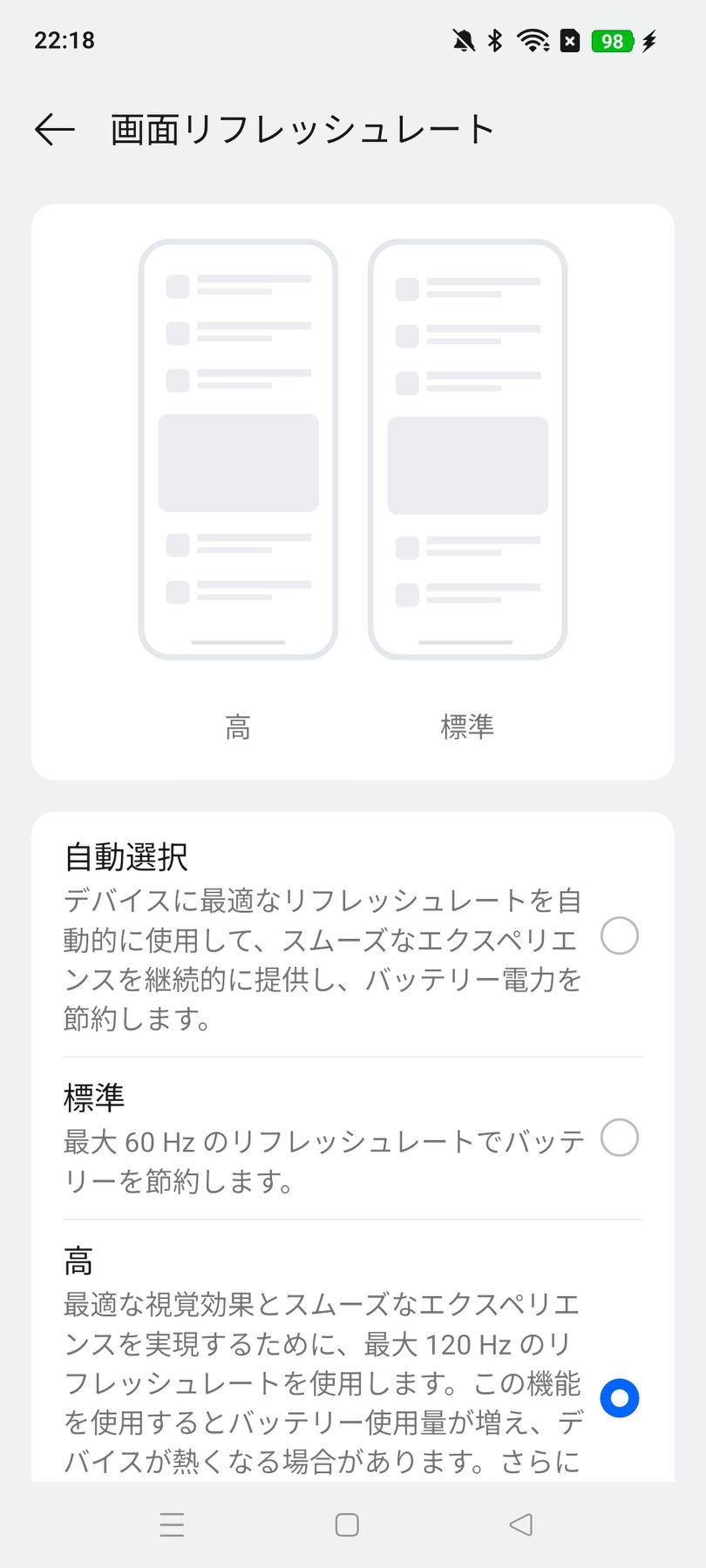 設定画面からリフレッシュレートを選択可能で、基本は 60 Hz 、ゲームなどで必要であれば120 Hz を使用できる。自動でリフレッシュレートが選択されるモードも存在し、バッテリー消費と映像の美しさのバランスを取ることができる。