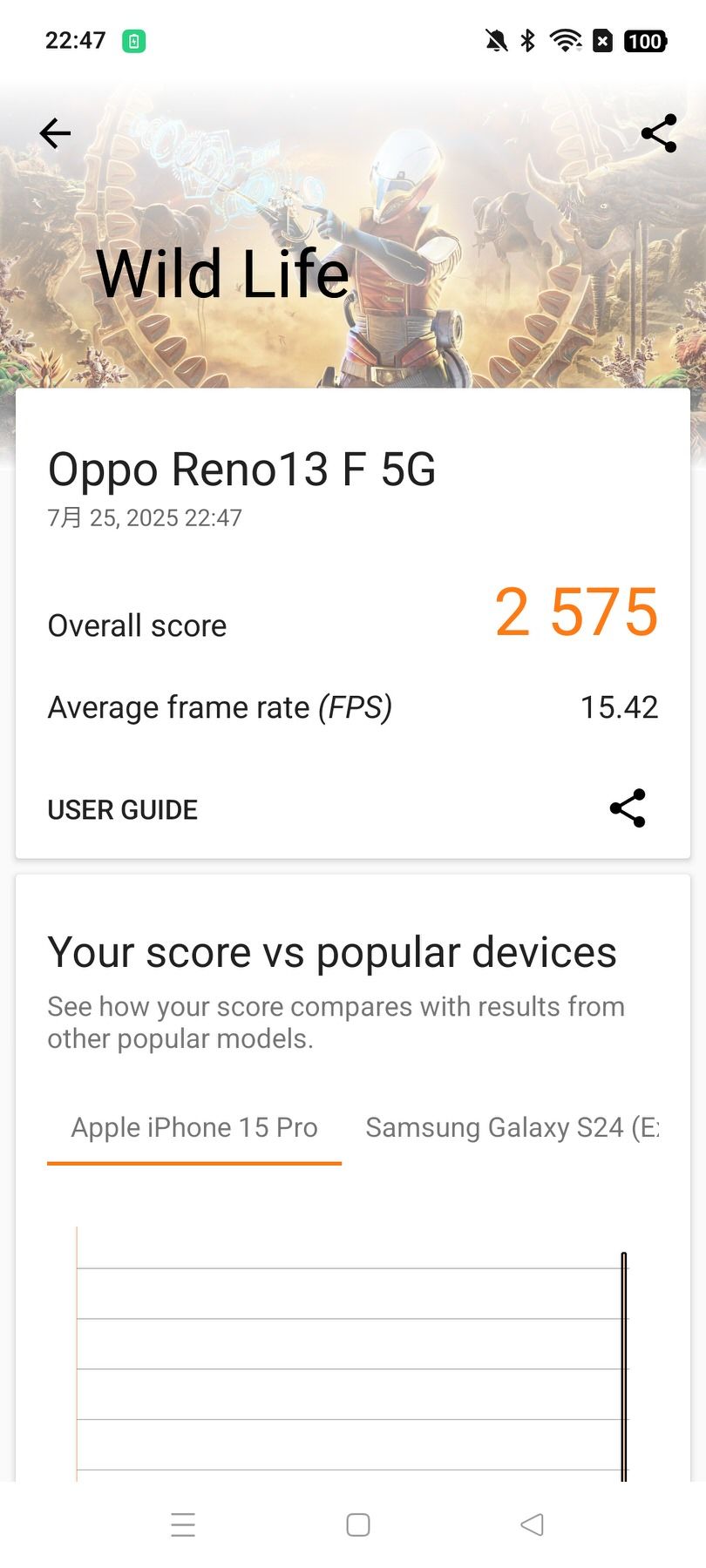 Oppo Reno13 A の結果は、平均FPSが15.42、総合スコアが2575であった。