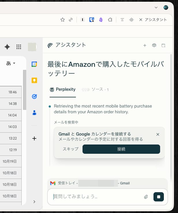 コネクタを利用することで、CometアシスタントがGmailなどの他社サービスの履歴・記録まで一括検索することが可能になる。自力で何年も前のメール履歴を掘り返すには非常に時間がかかるので、生産性がめちゃくちゃ向上する。
