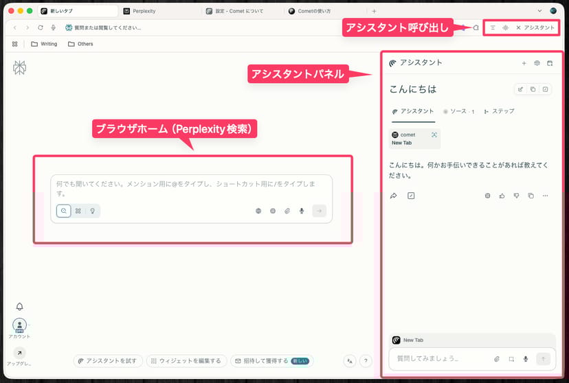 画面右側の「アシスタント」パネルで質問をした場合、インターフェース上は違いがないように見えるが、実際には裏側で「Comet Assistant」と「Comet Agent」という二つの異なるレイヤーが存在している。