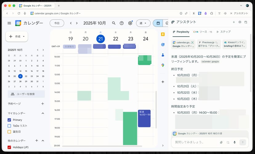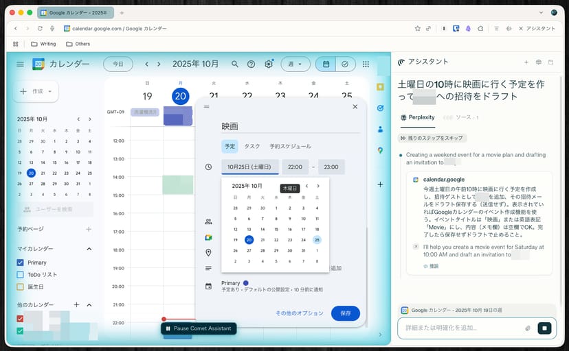 例えば、「Googleカレンダーの予定を作って」とCometに依頼すると、ブラウザのカーソルが勝手に動き出し、カレンダーの予定を新規作成してタイトルや日付を入力してくれる、という驚きの体験が味わえた。