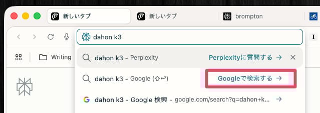 URLバーに検索ワードを打ち込んだ後、普通に「Enter」だけを押すとPerplexity検索になってしまうが、「Shift + Enter」キーを押すとGoogle検索を使用することができる。